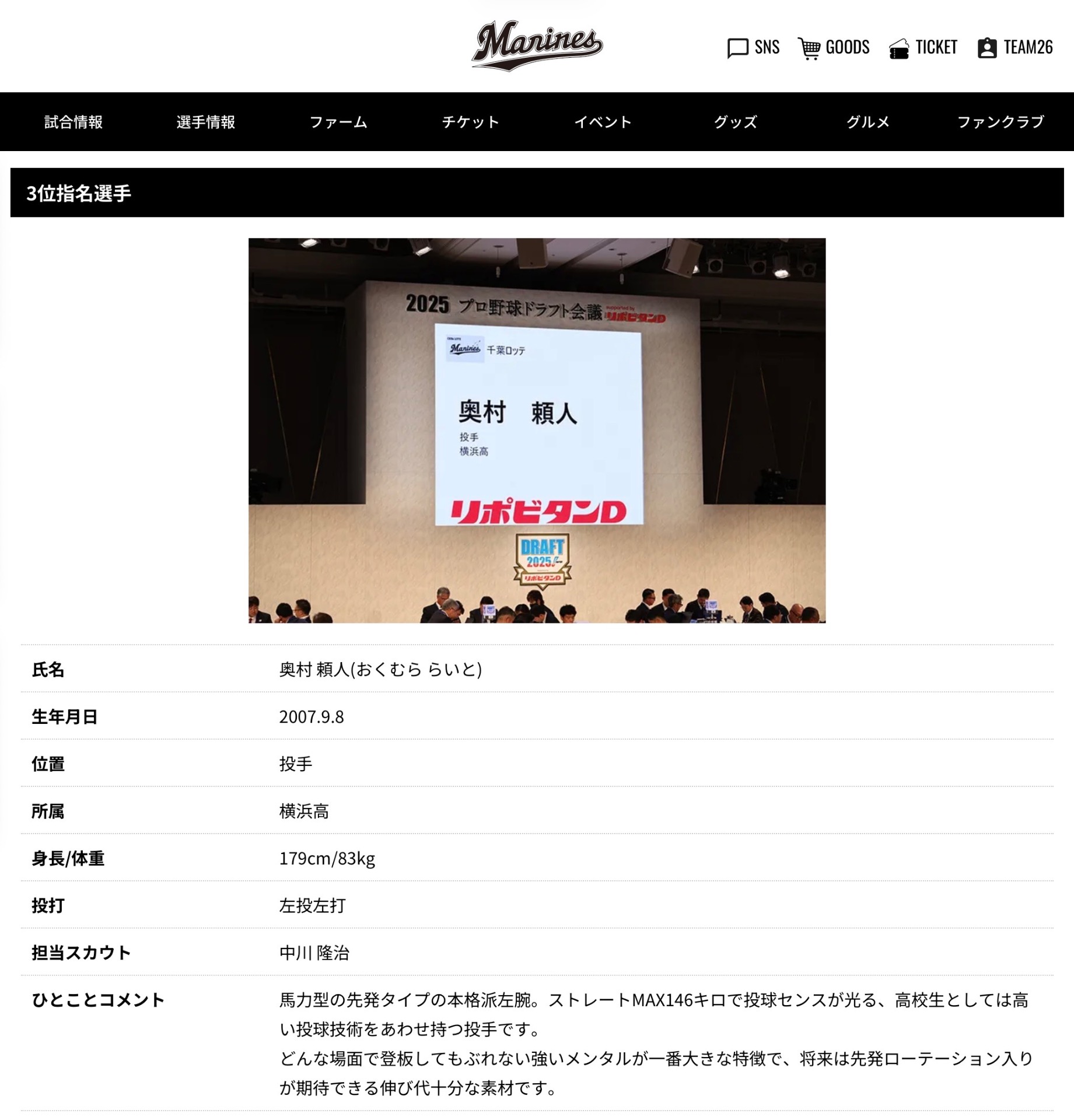 【お知らせ】34期生 奥村頼人さん 千葉ロッテマリーンズからドラフト3位指名!